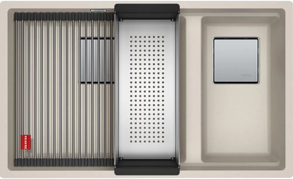Zlewozmywak Prostokątny 76 cm / 46 cm producenta Franke. Ilość komór: 1,5 komorowe, materiał: Granitowe, montaż: Podwieszane. Informacje dodatkowe: Akcesoria w zestawie