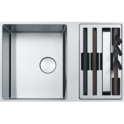 Zlewozmywak z serii Box Center BWX 220-41-27 zawiera w zestawie dopasowane akcesoria takie wkładka ociekowa, drewniana i syntetyczna deska do krojenia, zestaw noży, suszarka do naczyń oraz korek automatyczny sterowany przyciskiem Easy Click w wykończeniu stali szlachetnej. Płaskie krawędzie SlimTop umożliwiają wbudowanie zlewozmywaka w blat lub jego montaż na równi z blatem. Box Center to nowa definicja klasycznego zlewozmywaka, zachowującego swoje tradycyjne funkcje, a zarazem przekształconego w nowoczesne centrum przygotowywania posiłków. Stal szlachetna, z której produkujemy zlewozmywaki FRANKE, to materiał najwyższej jakości i gwarancja odporności na korozję, uszkodzenia, gwałtowne zmiany temperatur i promieniowanie UV. Ten model posiada element estetyczny w postaci osłony odpływu ze stali szlachetnej, która nie ogranicza przepływu wody, a jednocześnie dopełnia komorę, nadając jej jednolity, nowoczesny wygląd.