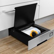 Do zabudowy pod szafką kuchenną. Zamontowany w cokole mebla zajmuje niewiele miejsca i jest zawsze gotowy do pracy, bez konieczności przygotowania go do pracy (rozwinięcie i podłączenie przewodu zasilającego, oraz rury i odpowiedniej końcówki ssącej. Może być zamontowany w każdej chwili, nawet w meblu już gotowym. Aby zamontować odkurzacz należy w cokole wykonać wycięcie o szerokości 345 mm i doprowadzić zasilanie 230 V. W tylnej części odkurzacza umieszczone są rolki, wystarczy go trochę unieść i można go przesuwać. Po opuszczeniu jego położenie jest ustabilizowana, a szczelina ssąca znajduje się na wysokości podłogi. Włączenie odkurzacza następuje przez naciśnięcie stopą lub szczotką umieszczonego na obudowie przycisku